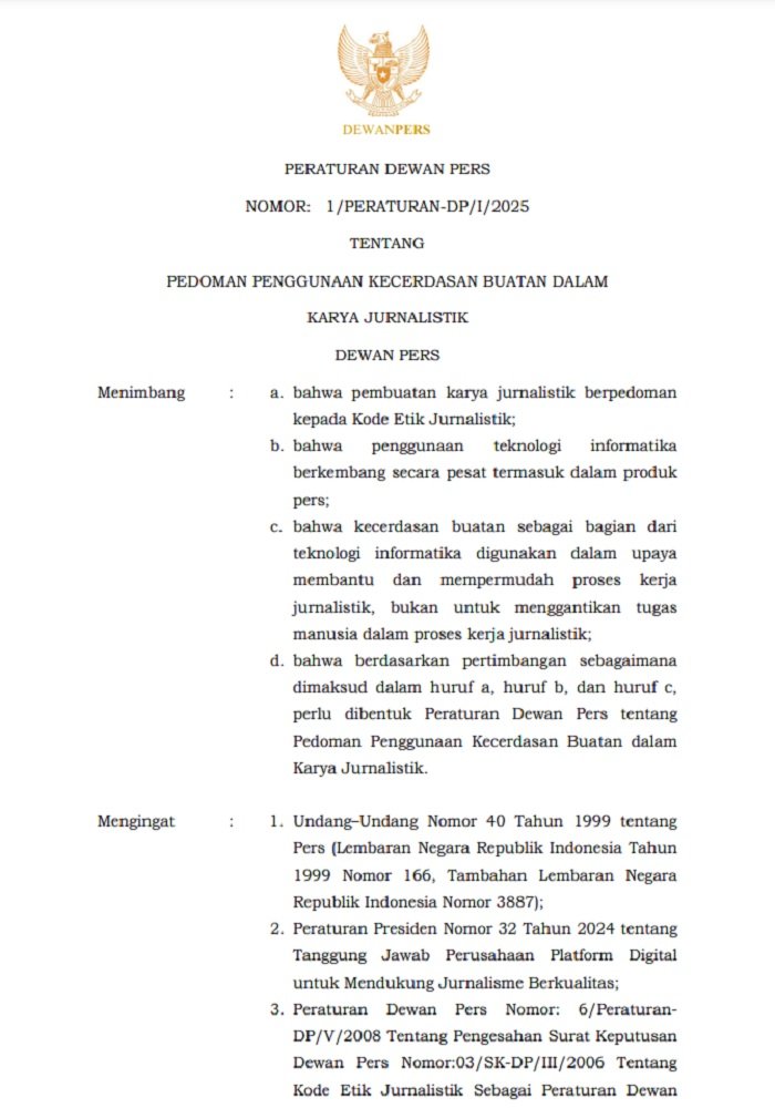 Untuk itu Dewan Pers menerbitkan Peraturan Dewan Pers Nomor 1 tahun 2025, tentang Pedoman Penggunaan Kecerdasan Buatan dalam Karya Jurnalistik. Pedoman ini menjadi bagian pnting dari Kode Etik Jurnalistik sebelumnya.