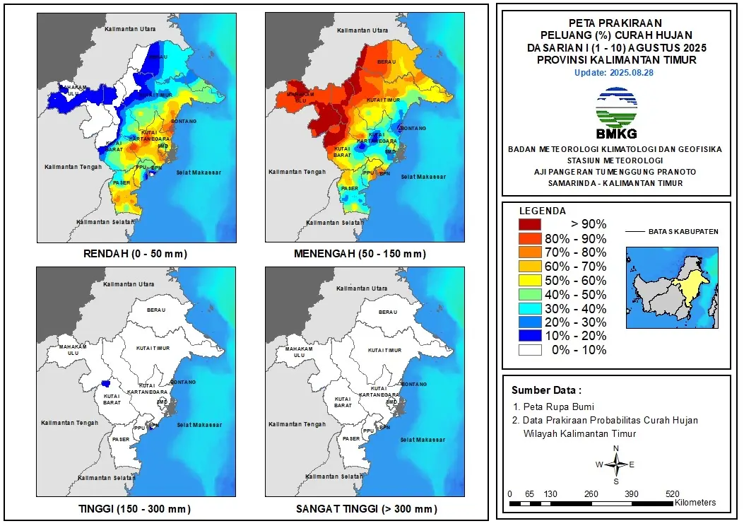 - Bagian timur & selatan Kaltim → curah hujan rendah (0–50 mm), peluang hujan >70%.